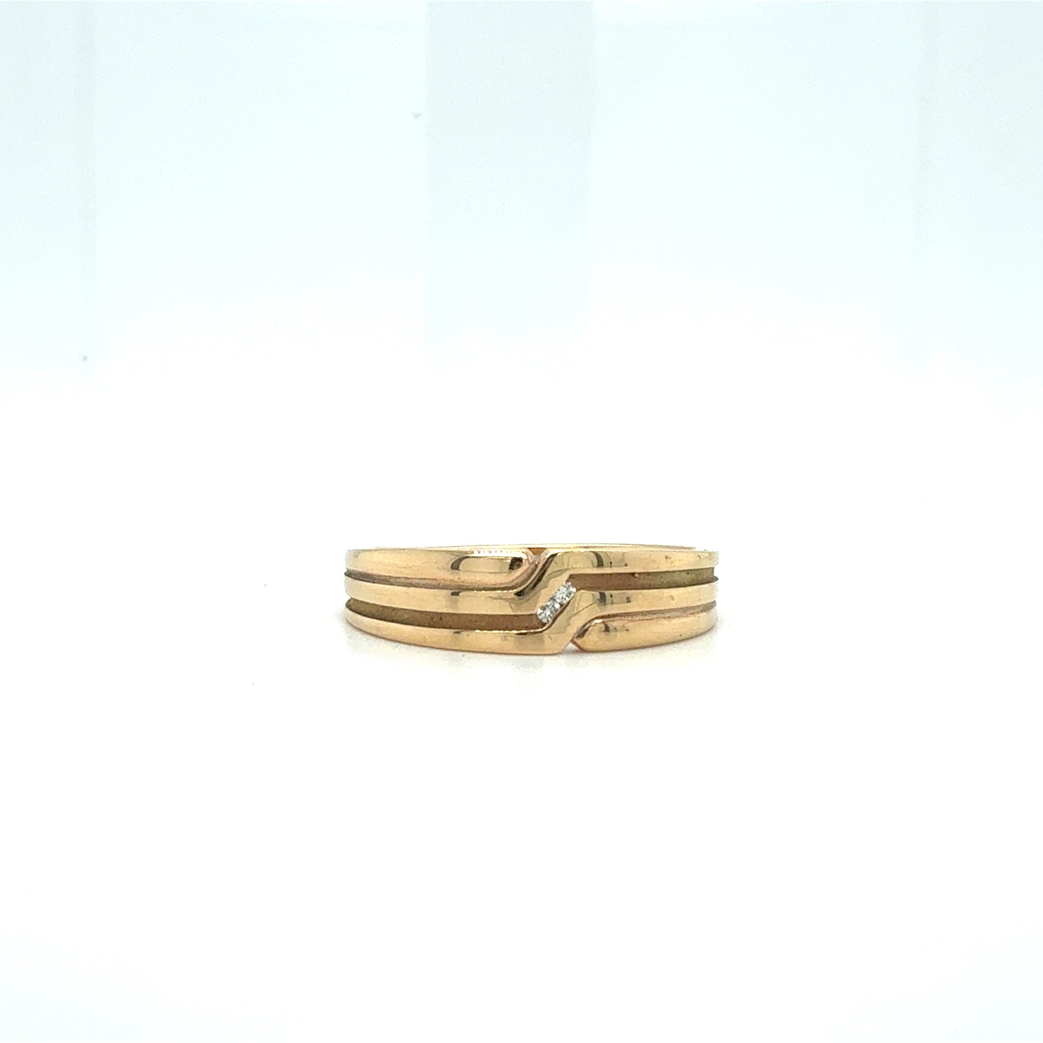 Nestled subtly into the central curve of the band are two small, brilliant-cut diamonds. These twin diamonds add a focused sparkle and a touch of refinement without overpowering the ring's modern silhouette. The wide band and smooth finish ensure comfortable wear and a distinguished appearance. This versatile piece is perfect for a contemporary wedding band or an everyday statement ring.