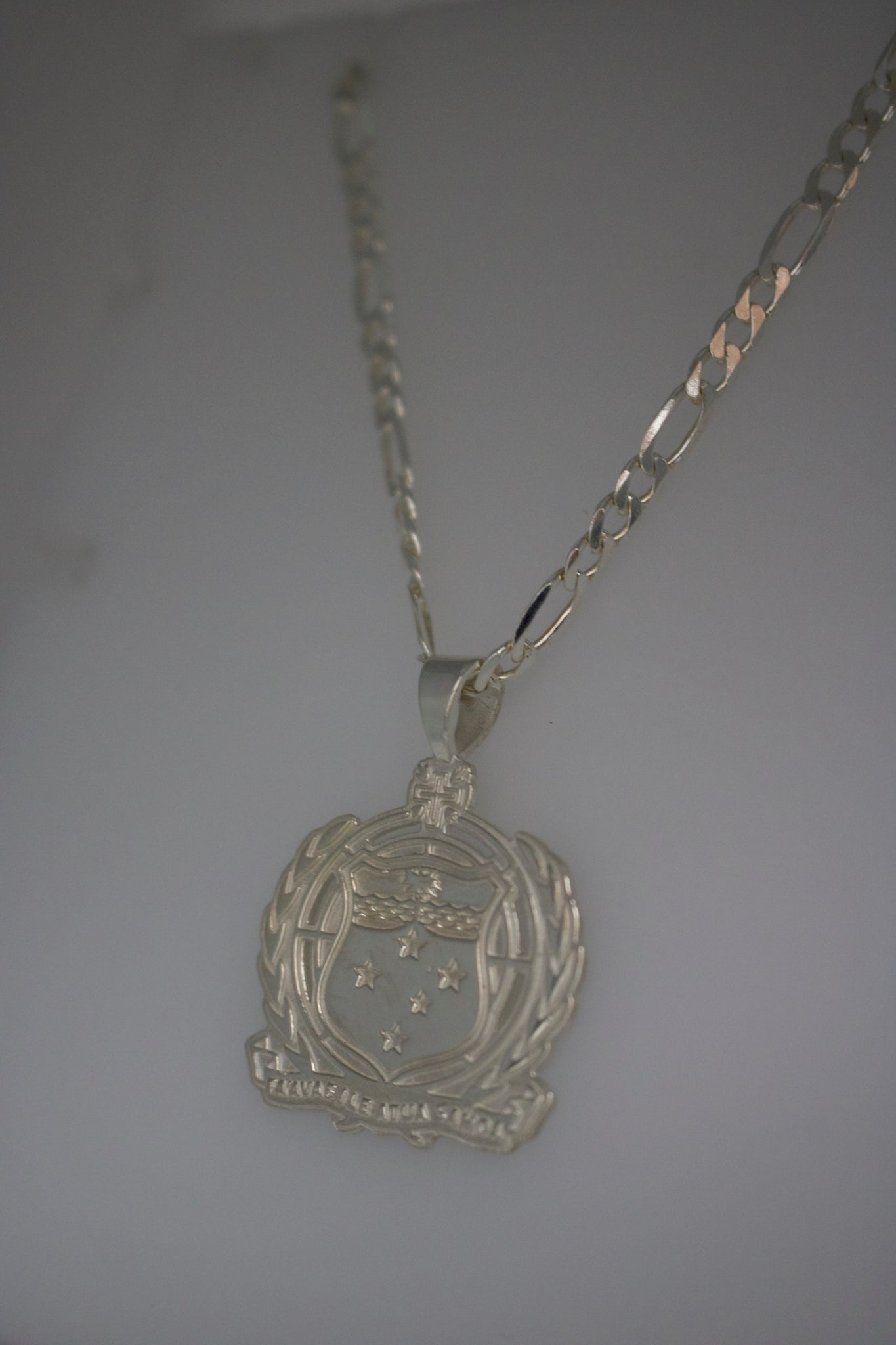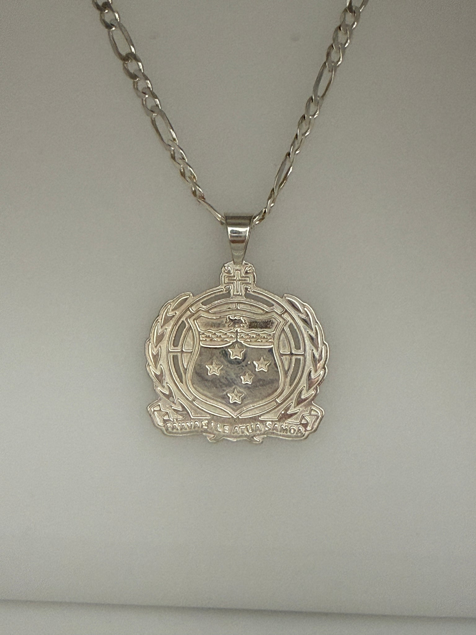 This is the Samoan Sila (Coat of Arms) pendant, beautifully embossed and crafted in genuine 925 Sterling Silver.